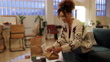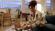 Cheerful young female is unpacking takeaway food delivery. She is in living room at night.