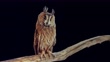 Asio otus - Long-eared owl sits on the branch on a black background at night - 4K stock video