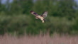 Bird - Short-eared Owl ( Asio flammeus ) flying over the meadow looking for prey on a summer morning. Slow motion.