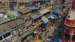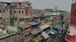 Aerial shot captures the dynamic everyday life of a diverse crowd in India, with pedestrians, vendors, and vehicles bustling along an urban street, surrounded by colorful buildings and local businesses in action.