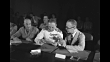 Delegates seated at table / delegates at tables, others seated behind / various shots closer view delegates including US Deputy Secretary of State Edward Stettinius and Secretary of State Cordell Hull / delegates, most military / four delegates at table / delegates including Admiral Percy Noble and Sir Alexander Cadogan (wearing eyeglasses); Cadogan hands paper to Noble / Stettinius with State Department official Leo Pasvolsky and US diplomat Joseph Grew, the latter two holding pipes / pan Andrei Gromyko and the Soviet delegation / delegates / delegates, some clapping / group of photographers in middle of delegates at tables / VS delegates at tables, with VO of conversations, some in Russian / MS delegates, some military / delegates / delegates seated in room; they all stand and start to leave / delegates seated with few in process of sitting; pan delegates; VO gavel bangs, bringing session to order / Note: exact day not known