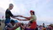 A small group of friends dancing with each other on their shoulders at a festival. Everyone is lauging and enjoying themselves. The festival is in Northumberland in the north east of England.