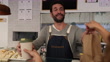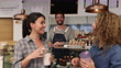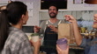 Friendly waiter handing a take out order to female friends at a bakery - 4K stock video