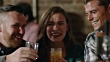 Friends cheers and clink glasses sitting at crowded bar - HD stock video