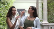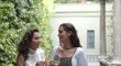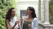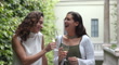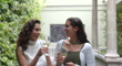 MCU female friends in discussion while sharing wine in courtyard garden of luxury boutique hotel