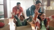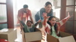 Happy family, children with boxes and playing in new home with smile, mom and dad in living room. Man, woman and excited kids in house together for moving, investing and real estate with fun games. - 4K stock video