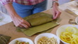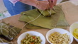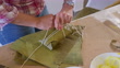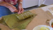 Mature woman hands tying hallaca, Venezuelan traditional Christmas food. - 4K stock video