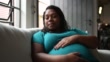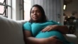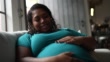 Pregnant woman touching her belly and contemplating at home