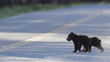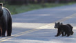 MS 4K shot of a grizzly bear (Ursus arctos) with 2 tiny newborn cubs dancing across the road - 4K stock video