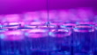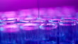 slow motion close up of science lab research test tube - pipette dripping droplets to dropper surrounded by neon reflection