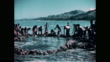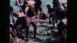 1950s: fish inside homemade net. Men spear fish inside net. Men string together fish on shore