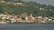 Wide panning shot of boat in ocean near waterfront / St. Georges, Greneda - HD stock video