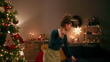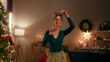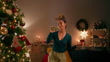 Woman enjoying a video call on her smartphone while celebrating christmas at home with festive decorations and cheerful vibes