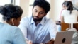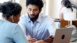 Helpful male bank employee explains banking services to a female customer. The bank employee is reviewing a bank flyer with the customer.