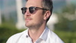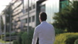 Millennial commuter riding e-scooter on a sunny day on walkway in business district