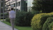 Young commuter riding e-scooter on walkway in business area - 4K stock video